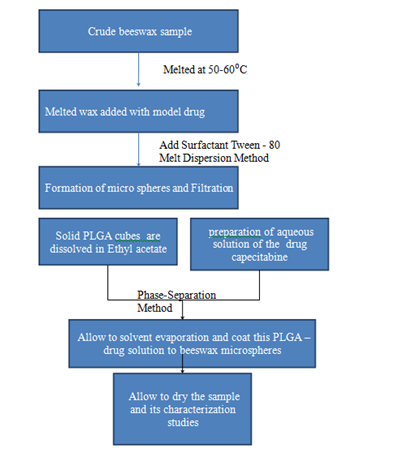 Capecitabine is a prodrug of 5‒fluorouracil which is inactive, and this prodrug converted into an active drug via enzymatic conversion occurring only in tumour tissue.6 It is an oral prodrug of 5‒FU which passes as a native formulation through the gut wall and then converted into 5'dFCR following changed to 5'‒deoxy‒5‒fluorouridine (5'dFUR) in the liver via enzymatic reaction with carboxylesterase and cytidine deaminase respectively. 5'dFUR is finally then converted to 5‒FU via thymidine phosphorylase or uridine phosphorylase.6,7 The main mechanism of 5‒FU activation is conversion to fluorodeoxyuridine monophosphate (FdUMP) which inhibits the enzyme thymidylate synthase (TYMS), a component of the folate‒homocysteine cycle and purine and pyrimidine synthesis Table 1. This paper deals the synthesis of beeswax microspheres by using melt dispersion method and to evaluate the drug loading capacity of the microspheres by using a model anti‒cancer drug capecitabine and its drug release studies and to coat the PLGA polymer incorporated with the model drug, on the outer surface of the beeswax microspheres and its characterization studies Figure 2.