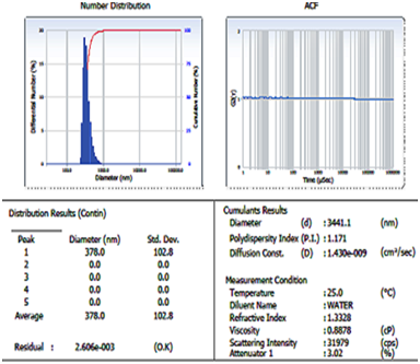 Particle size analysis was performed by dynamic light scattering (DLS) with a Malvern Zetasizer 3000HSA (Malvern Instruments, UK). Figure 5A & 5B shows particle size distribution of beeswax microspheres. DLS yields the mean diameter and the polydispersity index (PI) which is a measure of the width of the size distribution. The mean diameter and PI values were obtained at an angle of 90° in 10mm diameter cells at 25°C. Prior to the measurements, all samples were diluted with double distilled water to produce a suitable scattering intensity. The synthesized microspheres were in the mean diameter of 3441nm or 34µm.9,10