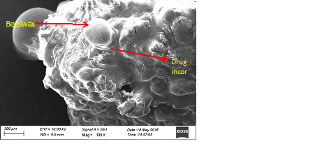 Surface morphology of the microspheres was observed on the scanning electron microscope (Zeiss‒Model S3). From the Figure 6, the distribution of beeswax microsphere in PLGA was observed uniformly. The spherical shape of beeswax microspheres were easily visualised. At the elevated temperature of above 35⁰C, the PLGA with the appearance of semi‒solid gel phase can be easily observed with beeswax microspheres.