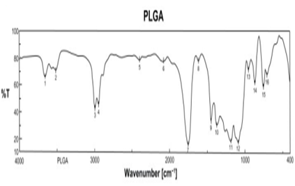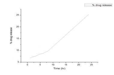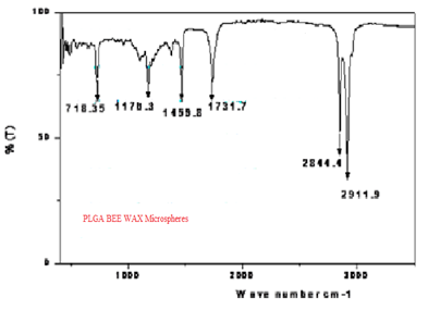 Drug‒polymer interactions were studied by FTIR spectroscopy (Model Name FT/IR‒6300 type). The spectra were recorded for the pure drug, drug‒loaded microspheres and PLGA coated microspheres using FTIR. Samples were prepared in KBr disks (2mg sample in 200mg KBr). The scanning range was 400–4000cm‒1 and the resolution was 2cm‒1. The results of FTIR analysis of this study show different stretches of bonds shown at different peaks. Figure 7 shows peaks near 2918‒2850cm‒1 which corresponds to C‒H stretch, peaks near 1736cm‒1 corresponds to C=O stretch, peaks near 1173cm‒1 corresponds to a functional group of esters. In Figure 8, 1750‒1760cm‒1 corresponds to a carbonyl group. 1200–1000cm−1 region corresponds to C–OH side groups and peaks near 1421cm‒1 corresponds to C=C stretch, peaks near 1160‒1083cm‒1 corresponds to ether group, peaks near 1408cm‒1 corresponds to aromatic stretch. Thus, we could conclude that the missing functional groups in Figure 9 may participate in the bonding of beeswax and PLGA polymers. From the release studies, it was observed that there was an initial burst of a drug in the solution due to the Swelling of PLGA. In the first 2h, at 6.8pH, 6% of the drug release was observed. But after 2hours the release of a drug was in a slow rate. The microspheres showed a sustained release pattern at pH 6.8 (Figure 10). In 24hours the drug release was in a linear manner and approximately 26% of the drug was released in the dissolution medium of pH 6.8.11‒15