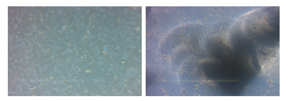 Several cells present in cell culture flask was calculated using Neubauer chamber. 10µl of cells and 10µl Tryphan blue dye was added and mixed well. 10µl of this sample mixture was taken and poured under the coverslips and chamber. This was viewed under microscope and cells were counted using the formula given below. No of cells in 1ml=Total no of cells in 16 small squares *2 (dilution factor)*104