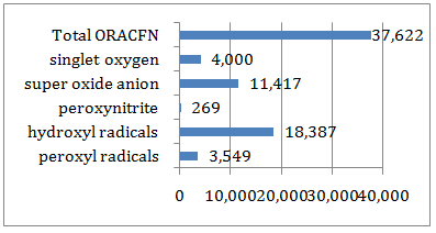 Studies carried out at the Brunswick Laboratories (South borough, MA, United States) have shown that SBLS ranks among the highest Oxygen Radical Absorbance Capacity (ORAC) of all food plants with total ORACFN of 37,622µmoleTE/g of the dry powder (Figure 1). This variety of Sorghum was found to contain significant levels of antioxidant activities against peroxyl radicals (3,549µmoleTE/g), peroxylnitrite (269µmoleTE/g), hydroxyl radicals (18,387µmoleTE/g), superoxide ions 11,417µmoleTE/g) and singlet oxygen (4,000µmoleTE/g). In fact, the antioxidant capabilities of SBLS extract is greater than that of the anthocyanin-rich acai berry indicating its exceptionally high antioxidant potential (Figure 2). According to these findings it seems that specific varieties of Sorghum like the one described here could positively assist in reducing the severity of several health conditions, as the antioxidant activity is able to contribute to cellular adjustments to oxidative stress.