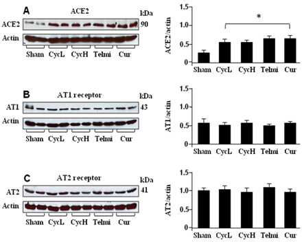 Figure 1 Expression of ACE2, AT1 and AT2 receptor at the end of 5 weeks of dietary cyclosporine treatment. A, B and C are representatives of tissue protein levels of ACE2, AT1 and AT2 receptor by Western blot. All bands were normalized by actin as a loading control. Saline control (Sham); low dose of cyclosporine (10mg/kg/day, CycL); high dose of cyclosporine (30mg/kg/day, CycH); telmisartan+high dose of cyclosporine (Telmi), curcumin+high dose of cyclosporine (Cur). Values are mean±SEM; n=7 for each group. *p<0.05 all group vs Sham.