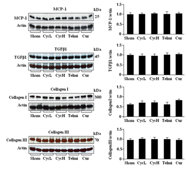 The protein levels of MCP-1, TGFβ1, collagen I and collagen III were analyzed using Western blot assay. As shown in Figure 2, MCP-1 TGFβ1, collagen I and collagen III were constitutively expressed in the sham control. At week 5, administration of low or high dose of dietary cyclosporine had no significant effect on protein levels of these parameters measured. Furthermore, these protein levels were also not altered by co-administration of telmisartan or curcumin with cyclosporine (Figure 2).