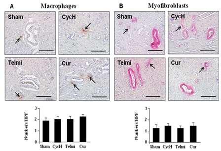Macrophage accumulation and myofibroblast proliferation were detected using immunohistochmical staining. As shown in Figure 3A, a few macrophages were detected in the myocardium in the sham group. Dietary high dose of cyclosporine had no significant effect on macrophage accumulation relative to the sham control at week 5. Furthermore, co-administration of telmisartan or curcumin with high dose of cyclosporine for 5 weeks also did not affect the number of positively-stained macrophages relative to cyclosporine treatment alone. The proliferation of fibroblasts was identified as accumulation of the α-SMA-expressing myofibroblasts. As shown in Figure 3B, a few of α-SMA expressing myofibroblasts were only present in the vascular smooth muscle, but not in the myocardium in the sham group. Furthermore, dietary cyclosporine treatment did not produce a significant increase in the number of proliferated fibroblasts relative to the sham control. Furthermore, 5 weeks of co-administration of telmisartan or curcumin with cyclosporine also did not change the number of α-SMA expressing myofibroblasts compared with cyclosporine treatment alone.