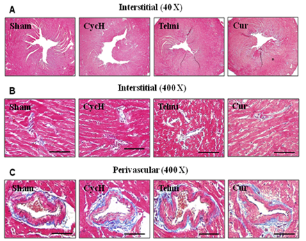Experimental protocol and group: Five weeks of experimental period was selected for all experimental groups. Mice were randomly assigned into one of five groups: 1) Saline control (Sham, n=6): Saline (2 ml) were fed by gastric gavage daily; 2) Low dose of cyclosporine (CycL, n=7): cyclosporine (25 mg capsule, Apotex Corp. Florida, USA) was administered at a dose of 15 mg/kg/day by gastric gavage; 3) High dose of cyclosporine (CycH, n=7): cyclosporine was administered at a dose of 30 mg/kg/day by gastric gavage; 4) telmisartan+high dose of cyclosporine (Telmi, n=7): telmisartan (Boehringer Ingelheim Pharmaceuticals, Inc., Ridgefield, CT, USA) at a dose of 10mg/kg/day plus 30mg/kg/day of cyclosporine were co-administered by gastric gavage; 5) curcumin+high dose of cyclosporine (Cur ): Curcumin (Cur, n=7): Curcumin (Sigma-Aldrich, CO, USA) at a dose of 150mg/kg/day plus 30mg/kg/day of cyclosporine were co-administered by gastric gavage. The doses of cyclosporine selected were primarily based on previous studies showing deleterious effects of the drug on renal fibrosis and dysfunction4,7,11 At the end of 5 weeks of the experiment, the mice from different groups were euthanized and the hearts were removed.