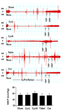 Figure 5 Change in blood pressure among groups at the end of 5 weeks of dietary cyclosporine treatment. The arrows indicate systolic blood pressure (SBP) and diastolic blood pressure (DBP). Difference in blood pressure among groups can be identified by a distance between cuff inflation from baseline (Base) and beginning of SBP tracing. Treatment with cyclosporine, telmisartan and curcumin did not significantly affect blood pressure as calculated from a mean arterial pressure (MAP). Values are mean±SEM; n=7 for each group.