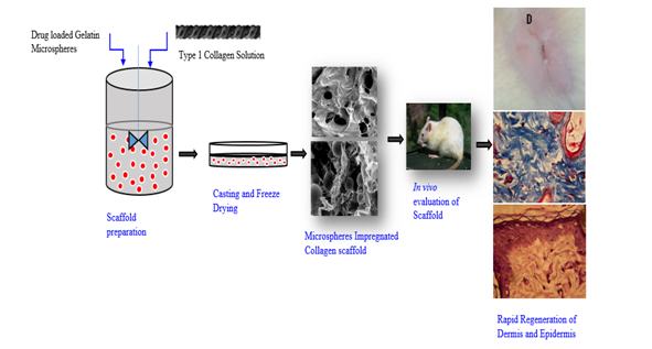The regeneration of injured soft tissue is still challenging. The wound pathogens at the wound site delays regeneration of dermis and epidermis produce high inflammation and cause degradation of extra cellular matrix at the wound site by its native enzymes such as microbial collagenase, elastase and another microbial protease. The most common pathogens infecting the dermal wounds are Staphylococcus aureus and Pseudomonas aeruginosa which produces microbial enzymes degrading the extracellular matrix at the wound site. The growth of microorganism at the site of injury and rate of wound regeneration is unbalanced causing the delay in wound regeneration. The antimicrobial agent impregnated in the scaffold is required to combat the growth of infection at the wound site and promote the wound repair process. The scaffolds made from protein based biomaterials acts as a template for dermal regeneration and mimics extracellular matrix at the damaged site. Collagen is the most abundant protein in the connective tissue such as cartilage, tendon, and ligament and surrounds the cells and forms the 3D cellular matrix of all tissue, giving each its characteristic structure, texture and shape.1,2 Normally Collagen based biomaterials are used as wound dressings for dermal regeneration.Since collagen itself, a protein in nature and not used in highly infected wounds, wound pathogens degrade these collagens and use this as substrates for their growth. The antimicrobial agents incorporated in collagen biomaterials help to stabilize the collagen biomaterial and also to decrease the infection in the wound. The sustained release of antimicrobial agents at the wound surface provides a prolonged antimicrobial activity to eradicate pathogens rapidly.3 A possible method to deliver the drug in a controlled manner is by entrapping it in the polymer matrix. Among the protein-based polymers, Gelatin is a protein material and produced by the denaturation of Type 1 Collagen and supports cell fate process and suitable for preparation of biodegradable microspheres which effectively encapsulates drug. Gelatin and collagen are very susceptible by enzymatic cleavage both microbial and mammalian cells and its degradation products excreted in the metabolic pathway. Due to its good biocompatibility and prolonged usage in drug delivery vehicles and tissue engineering scaffolds, its choice is right for this objective to construct an effective wound care system for infected dermal wound and regenerate the dermis and epidermis quickly Figure 1.
