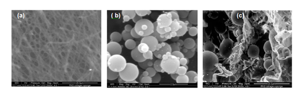 Figure 2 Scanning Electron Microscopic Studies (A) Plain Collagen Scaffold. (B) Drug loaded Gelatin Microspheres. (C) Gelatin Microspheres impregnated collagen scaffold.
