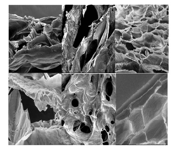 Figure 3 reveals the cross-sectional observation of the porous collagen scaffold used for the fabrication of a wound care system. The complex architecture of the collagen scaffold confirms the suitability of developing tissue engineering scaffolds for wound repair. The 3-dimensional porous scaffolds support angiogenesis and vascularization. Type 1 collagen is a predominant component of the extracellular matrix and this protein plays in cell fate process such as cell growth and differentiation and modelling the extracellular matrix. The complex architecture and interconnectivity pore with heterogeneity allows more interaction of cells with scaffold resulting faster regeneration of dermis and epidermis at the wound site.
