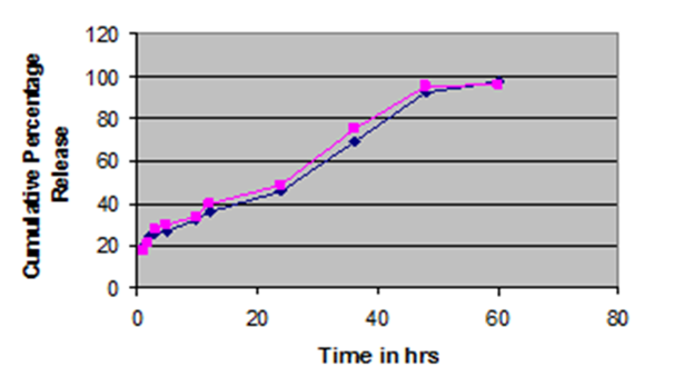 Gelatin microspheres are known to swell in aqueous environments due to hydration and Gelatin microspheres degraded by the presence of microbial enzymes secreted by wound pathogens and Matrix metallo proteinase involved in tissue remodeling. Drug release profile shows that 27% of drug burst released within 5hours followed by controlled release up to 2days. Figure 3 The burst release of ciprofloxacin into the wound site immediately controls the eradication of microbial pathogens at the site of injury and sustained release of the drug combat the further growth of microorganisms, resulting the infection load and activated the wound repair process.
