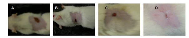 Figure 5 Wound contractions at 12th Day (A)-Open wound, (B)-Plain collagen scaffold, (C)-Antibiotic Incorporated Collagen scaffold, (D)–Drug-loaded Gelatin microspheres impregnated collagen scaffold.