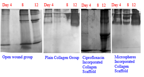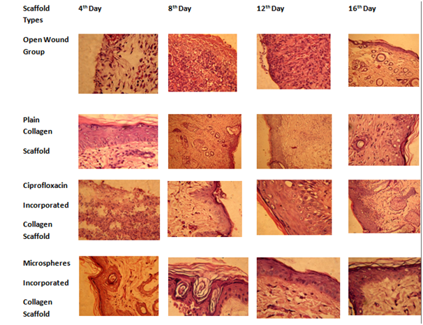 Figure 6 confirms the healing patterns of wound repair by the collagen scaffold and gelatin microspheres incorporated collagen scaffolds. In the case of Cipro incorporated collagen scaffold and gelatin microspheres incorporated collagen scaffolds, the regeneration of dermis and epidermis were observed and followed by the 12th day and 16th day, the complete formation of dermis and epidermis were over served. In these same groups, the neutrophils on the granulated tissue taken from 4th day and 8th day were minimal and forming epithelization, confirming a start of a programmed sequence of wound repair.