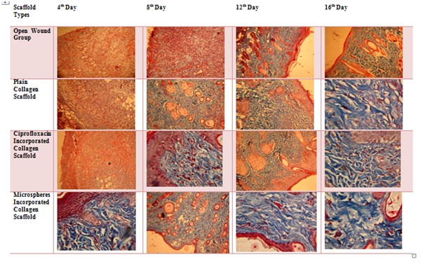 Figure 7 reveals the collagen synthesis in the granulated tissue from the open wound and treated group via Masson’s trichrome staining. In the case of Cipro incorporated collagen scaffold and gelatin microspheres incorporated collagen scaffolds, the regeneration of dermis and epidermis were observed with well-formed collagen synthesis and followed by the 12th day and 16th day, the complete formation of dermis and epidermis were observed and well-stretched collagen bundles formed in the dermis region path. In these same groups, the neutrophils on the granulated tissue taken from 4th day and 8th day were minimal and forming epithelization, confirming a start of a programmed sequence of wound repair.