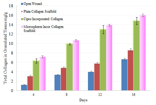 Figure 9 reveals the increase of the total collagen content in the granulated tissue and high content of collagen in the granulated tissue taken from a treated group such as drug incorporated collagen scaffold and microspheres incorporate collagen scaffold.