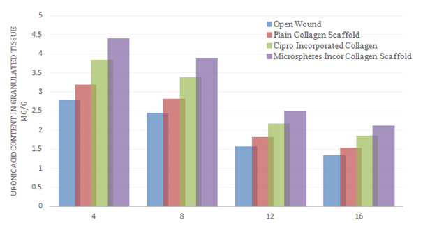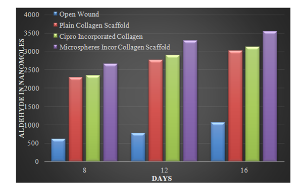 Figure 10 confirms the crosslinking of the collagen in the granulated tissue. The amount of aldehyde increased in the granulated tissue taken from the Cipro incorporated collagen scaffold and microspheres incorporated collagen scaffold confirming the formation of well stretched and crosslinked collagen in the tissue.