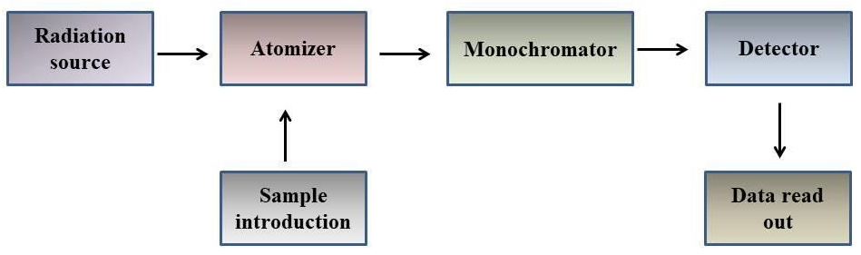 It is a quantitative analytical technique, generally known for the determination of almost more than 70 trace elements. This technique works on passing the light of specific wavelength by radiation source of an element. Hollow cathode lamp is the main part of this technique. The reduction in the amount of light intensity reaching the detector is seen as a measure of the concentration of element in the original sample. Atomic absorption spectrometer comprises of a light source, an atomizer for sample placement, monochromator, detector and a plotting of collected data (Figure 1).31