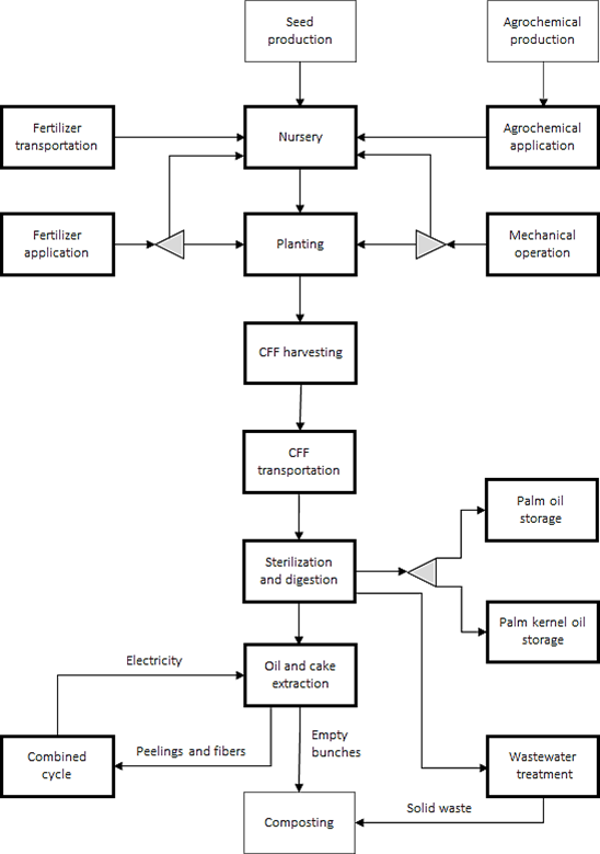 As shown in Figure 2, the palm oil production cycle consists of two main subsystems: agricultural and industrial. The agricultural subsystem includes the following activities: cultivating in nurseries, preparing the soil, managing crops, producing and applying fertilizers and agrochemicals, and harvesting and transporting fresh fruit bunches (FFB) to the processing facility.