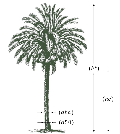 Similarly, the dry mass of each element was estimated. For this purpose, approximately 500 g samples of material (leaves, stems, petioles, rachises, leaflets, arrows, meristems, inflorescences, and fruits) were collected, weighed, and transported to the laboratory for drying in an oven at a temperature of 65°C until a constant mass was reached. The biomass content at 25 years was determined using the adjusted Chapman-Richards function,40 as described in Equation 1 (Eq. 1) below.