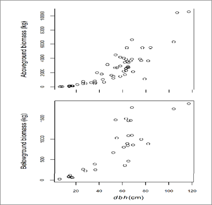 All data processing and analyses were carried out with R software. For the aboveground components of the trees, the total green mass weights of each tree component were multiplied by their respective average DG-ratios to obtain the component dry mass weights. The total AGB was found by summation of dry mass weights from stem, branches and twigs/leaves. On average, 54 %, 39% and 7% of AGB were distributed to stems, branches, and twigs/leaves, respectively. The mean total AGB of the sampled trees was 2453 kg while the minimum and the maximum were 11 kg and 10603 kg, respectively. A scatter plot of total AGB versus dbh is shown in Figure 2 (upper panel). The BGB of trees was computed as follows: