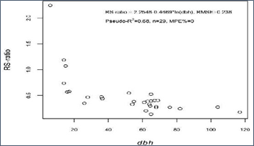 The mean RS-ratio of trees sampled for both AGB and BGB was 0.49 and varied from 0.14 to 2.24. A simple log-linear regression model showed that RS-ratio decreased with increasing dbh (Figure 3).