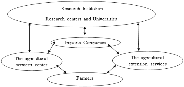 This proposed relation between the component had been designing from the reality of the agricultural work whereas a lot of partners had talked their place like the imports companies and the services centers which had found since 1992, the component involving all the agricultural partners, all these partners will be more effective because they in clear and official links with each other represents as teamwork, series to give effective delivery of information to farmers i.e. (adequate, updated recommended information, in the right time, by the best methods, with less costs to increase the best profit for all), as follows in Figure 2 below: