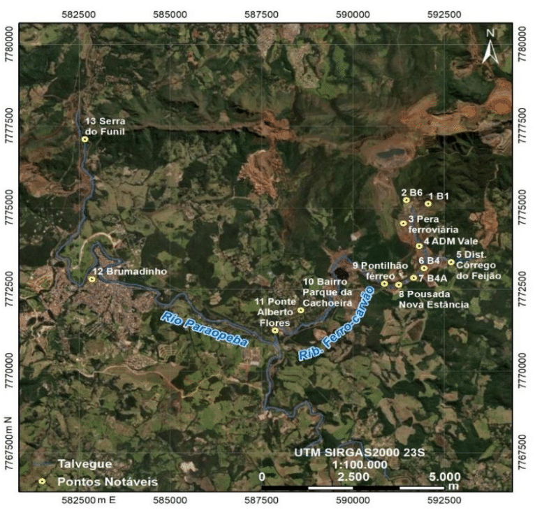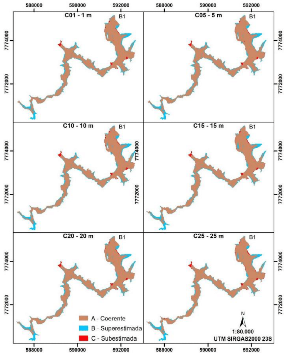 In general, it is possible to state that the scenarios presented a very similar performance in explaining the rupture of Dam 1, and that speed was the most sensitive variable to the change in terrain, without, however, presenting a very discrepant response in relation to the other metrics. analyzed. Thus, scales more detailed than 1:10,000 are capable of representing an event of the magnitude of Dam B1.