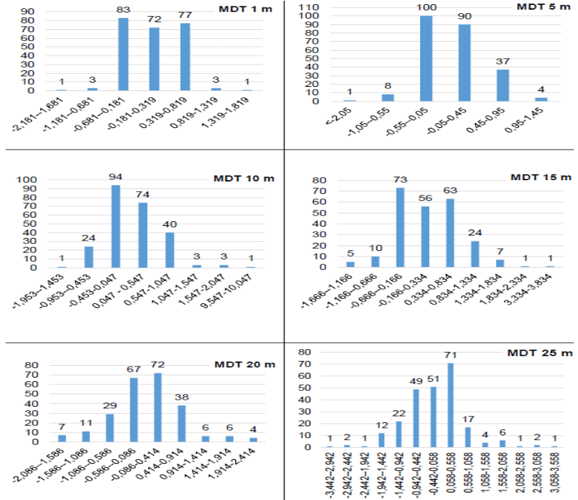 Where: ∆𝑍𝑖= elevation error at point i of the sampling set of𝑛samples; 𝑍𝑖= Altimetry of point i in the DTM under analysis; 𝑍𝑐𝑖= Altimetry of point i in the reference DTM (greater accuracy).