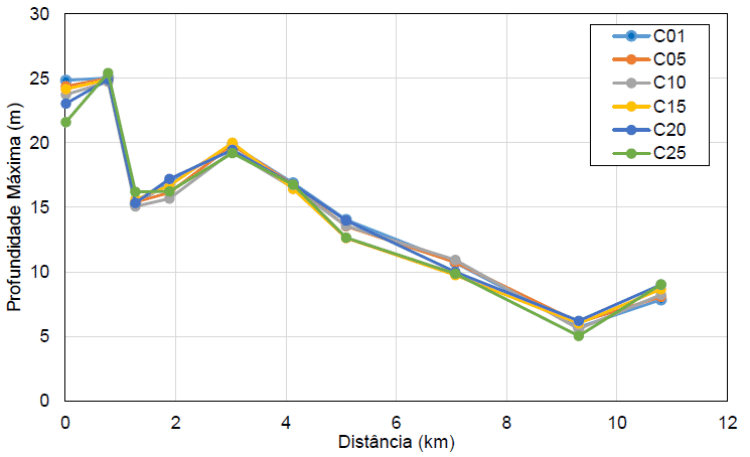 The depth results showed an average standard deviation of 50 centimeters, with the greatest depth difference found in the ST-01 section, corresponding to 1.16 meters around the average. This difference occurred precisely in the C25 simulation scenario, where the terrain has worse spatial resolution.