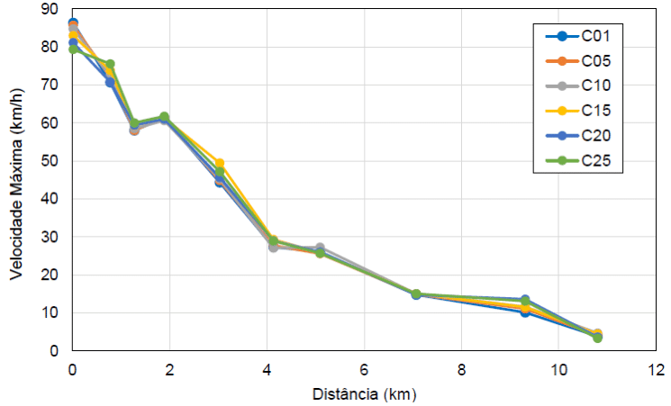 Regarding the maximum speed results, it is notable that the large difference in values occurred in the final section of the simulation, reaching a variation above 10%. When comparing the values of the representative sections and the observed values, a certain coherence can be seen between what occurred and what was simulated.