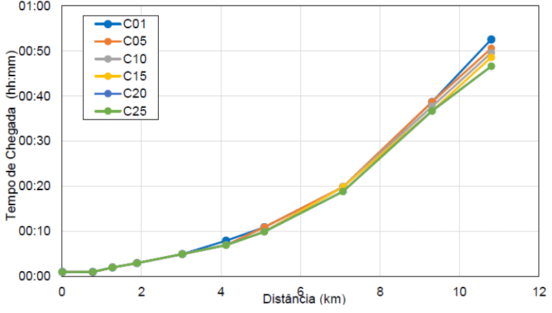 Regarding the arrival time, when analyzing the results of the cross sections more specifically, it is clear that in the first initial section of three sections, up to section ST-05, no change in the simulation result was found in this item. corresponding to the arrival time. It was found that the most sensitive change occurred in the last section, in the Paraopeba River, where the arrival time showed a maximum difference of 1 minute and 50 seconds, in relation to the average time of the different scenarios presented. When compared with the real event, it can be said that the model failed to represent the real chronology of the event. One of the possible reasons for this is due to the fact that although HEC-RAS version 6.0 contemplates the propagation of viscous fluids, it still does not have the ability to vary the volumetric concentration of this fluid in time-space, as the wave it incorporates the disturbed material along its path.