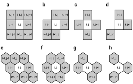 Figures E-H The same neighbourhoods, but on the hexagonal lattice. On each iteration for each site with coordinates (i, j) of a lattice its neighbourhood is studied, taking into account periodic boundary conditions. The neighbourhoods on the hexagonal lattice are used for modelling fecundity rate of individuals.