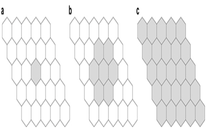 Figure 3 ‘Microhabitat’, ‘minihabitat’ and ‘macrohabitat’ on example of hexagonal neighbourhood on hexagonal lattice. The grey colour indicates: