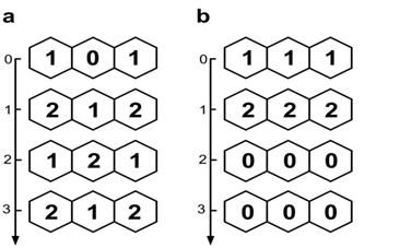 Figure 13 Examples of transformations of start states patterns in a model ecosystem with two competitors. The one-dimensional lattice of three cells closed by periodic boundary conditions. Hexagonal neighbourhood is used for propagation.