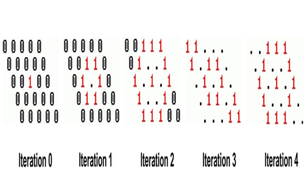 Figure 8 Colonization of the ecosystem by one species.14 ‘0’ – a free site of a microhabitat; ‘1’ – a microhabitat occupied by a living individual; ‘.’ – the regeneration state of a microhabitat is denoted here by the dot.