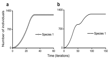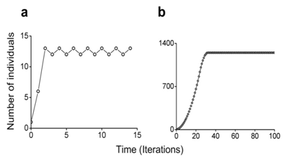 Figure 9 Single-species population dynamics.14 Logistic-like population growth curves. One individual is placed in ecosystem at the initial iteration.