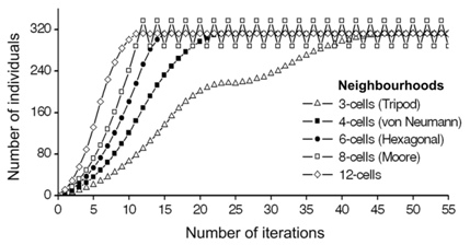Figure 10 Relationship between a neighbourhood type and population growth rate. A possible number of offsprings per one individual is determined by the type of the cellular automata neighbourhood. Hexagonal lattice is of 25x25 sites. One individual is placed in ecosystem at the initial iteration.