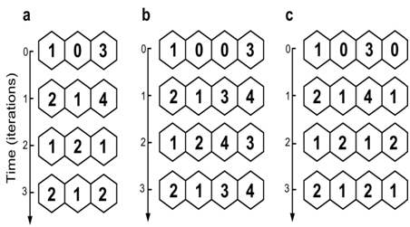 Figure 7 Examples of transformations of start states patterns in a model with one species. The one-dimensional lattice of three cells closed by periodic boundary conditions. Hexagonal neighbourhood is used for propagation.