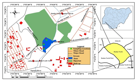 The study was carried on Agodi Reservoir located in Ibadan, Oyo State, Southern Nigeria. Ibadan is located on longitude 3˚5’ East of Greenwich meridian and latitude 70˚23’N west of the equator. Agodi reservoir was formed along Ogunpa River that flows into the reservoir. The reservoir has an area of 13 hectares stretching about 1km with a maximum depth of about 5m. The river upstream is often polluted by deposited solid and liquid waste products resulting from anthropogenic activities. The sources of pollution are predominantly sewage, urban run-off, and agricultural effluents consisting of chemical fertilizers, pesticides, industrial sources associated with different types of chemical pollutants which are both organic and inorganic, containing heavy metals and microbial organisms. Agodi Reservoir is therefore subject to enormous anthropogenic stress that deteriorates the water quality and contaminates the aquatic system including the fishes (ref).