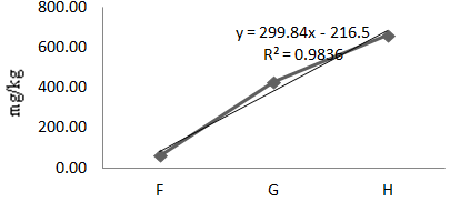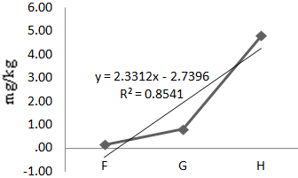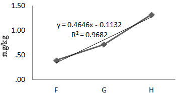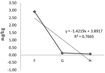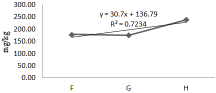 The mean concentration of Fe during the experimental year was 271.10mg/kg (Table 1). At P<0.05, the analysis of variance of the means showed significant differences of iron in fishes at various locations. A linear regression line of iron in Oreochromis niloticus along the sample locations showed a strong positive gradient at a correlation of 99.9% (Eqn. 4, Figure 5). That means, as one move from location F to G to H, there is a strong positive increment in Fe concentration. The concentration of Fe in the dry season was 0.21mg/kg and the concentration of Fe in the wet season was 542mg/kg. Iron varied with the seasons and the variations were statistically significant at 95% C.I. (Table 3).