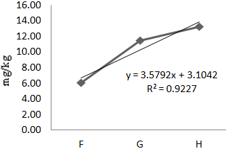 The mean concentration of Mn in Oreochromis niloticus for the experimental year was 303.06mg/kg (Table 1). The values differed significantly (P<0.05) across the sample locations which imply a gradient effect. A linear regression of Mn in Oreochromis niloticus along the sample locations revealed a strong correlation of 98% (Eqn. 5, Figure 6). In other words, as one moves from location F to G to H, there is a strong positive correlation that Mn will increase in the fish. The mean values of Mn in the fish for dry and wet seasons were 62.67mg/kg and 543.44mg/kg respectively (Table 3). Manganese varied with season and the variations were statistically significant.