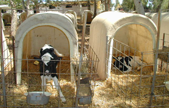 Calves are kept in individual pens opposite the birth pen for the first 3 days after birth. After the 3rd day, the calves are kept in fiberglass (width 106 cm, length 118 cm, height 140 cm) huts (Figure 2) until weaning.