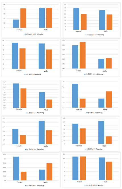 As a result of the analysis, in the analysis of blood parameters at birth and weaning period in male and female Holstein calves in Mediterranean climate conditions, the effect of gender was found to be different at the level of P<0,037 for glucose value and P<0,059 for GGT value. For phosphorus value, the interaction effect was found to be different at P<0,037 level. The GGT values of female calves were 34,88 Ul/l at birth and 26,85 Ul/l at weaning, while the values of male calves were 31.06 Ul/l at birth and 23,59 Ul/l at weaning. Glucose levels of female calves were 55,06 mg/dl at birth and 38.08 mg/dl at weaning, and 53,67 mg/dl at birth and 37,73 mg/dl at weaning in male calves. Phosphorus value in female calves was 9,80 mg/dl at birth and 7,73 mg/dL at weaning; in male calves it was 8,37 mg/dL at birth and 8,79 mg/dL at weaning.