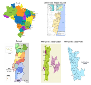 A Figure 1 illustrates the map of Brazil and the Metropolitan Area of Recife and the map of Portugal with Metropolitan Areas of Lisbon and Porto.