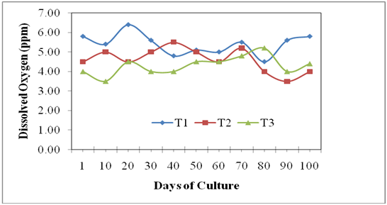 The dissolved oxygen level was observed to be varied unevenly between 4.5 and 6.4ppm in T1, 4.0 and 5.5ppm in T2, and 3.2 and 4.5ppm in T3, during the entire study period. Therefore, DO levels were obtained to be within the suitable range only in T1 and T2 in the present study. However, dissolved oxygen level was found to be fluctuated among all the three treatments (Figure 4).