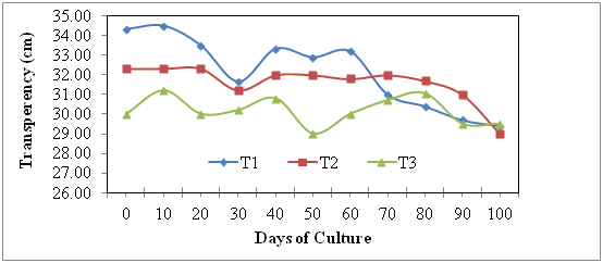 The water transparency values of the experimental ponds in all the treatments were varied from 28.5 to 44.0cm. In case of T1, the highest transparency value (34.5cm) was recorded on March 25, 2006, while the lowest value (29.4cm) on June 18, 2006. In T2, the highest value (32.3cm) was recorded on March 30 and April 9, 2006, while the lowest (29.0cm) on June 18, 2006. The transparency value (31.2 cm) was recorded on March 25, 2006, while the lowest value (29.5cm) on June 18, 2006 (Figure 5).
