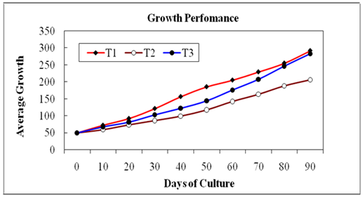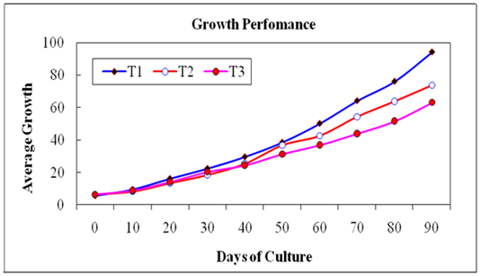 After 90 days of culture, the average body weight of catla in the three treatments T1, T2 and T3 were found to increase from 50g to 292.0, 206.0 and 282.7g, respectively. The growth performance was found to be better in T3 than that in T2, which might be due to the lower survival rate inT3. The cumulative growth trends of catla in the ponds at the three treatments are shown in Figure 7.