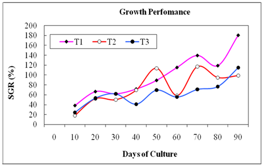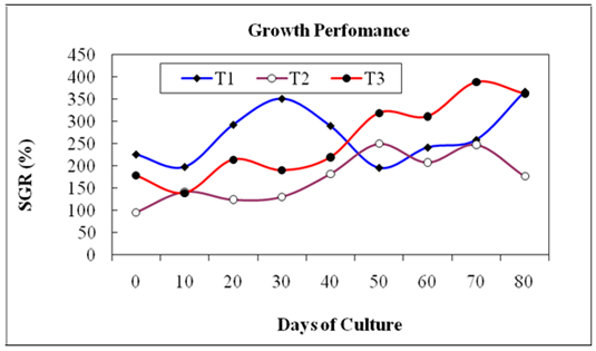 The daily growth rate or specific growth rate (SGR %/day) of C. catla by weight in all the treatments is presented in Figure 8. The SGR was 5.68%/day in treatment T1, 4.28%/day in T2 while 5.33%/day in T3, respectively (Figure 8).