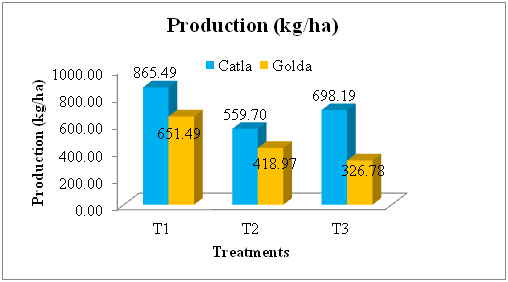 The production of M. rosenbergii in all the treatments is presented in Figure 13. Total production (kg/ha) of M. rosenbergii in T1, T2 and T3 was found to be 791.00, 517.34 and 429.48, respectively while for C. catla that was 865.48, 559.70 and 698.19 in T1, T2 and T3, respectively. The gross production (kg/ha) of M. rosenbergii and C. catla was found to be the highest (1,615.48) in T1 followed by T2 (1,077.00) and T3 (1,127.48).
