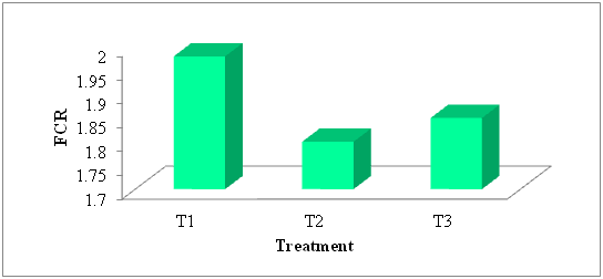 Feed conversion ratio: Feed conversion ratio obtained from the treatments is shown in Figure 14. FCR in T1, T2 and T3 was 1.98, 1.8 and 1.85, respectively.